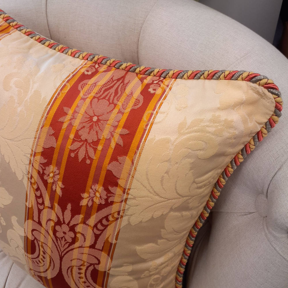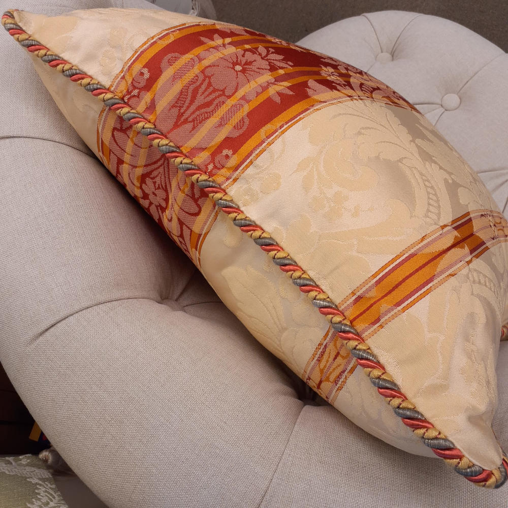 三色の糸で複雑な地紋柄を織り込んだフランス製生地にトリムが付いた高級クッションカバーです。