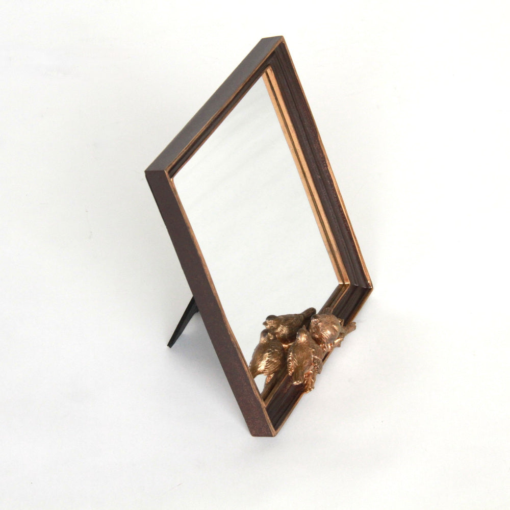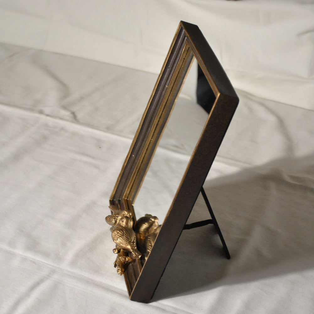 小鳥のレリーフが可愛いシックでエレガントなアンティーク風スタンドミラー(卓上鏡)です。