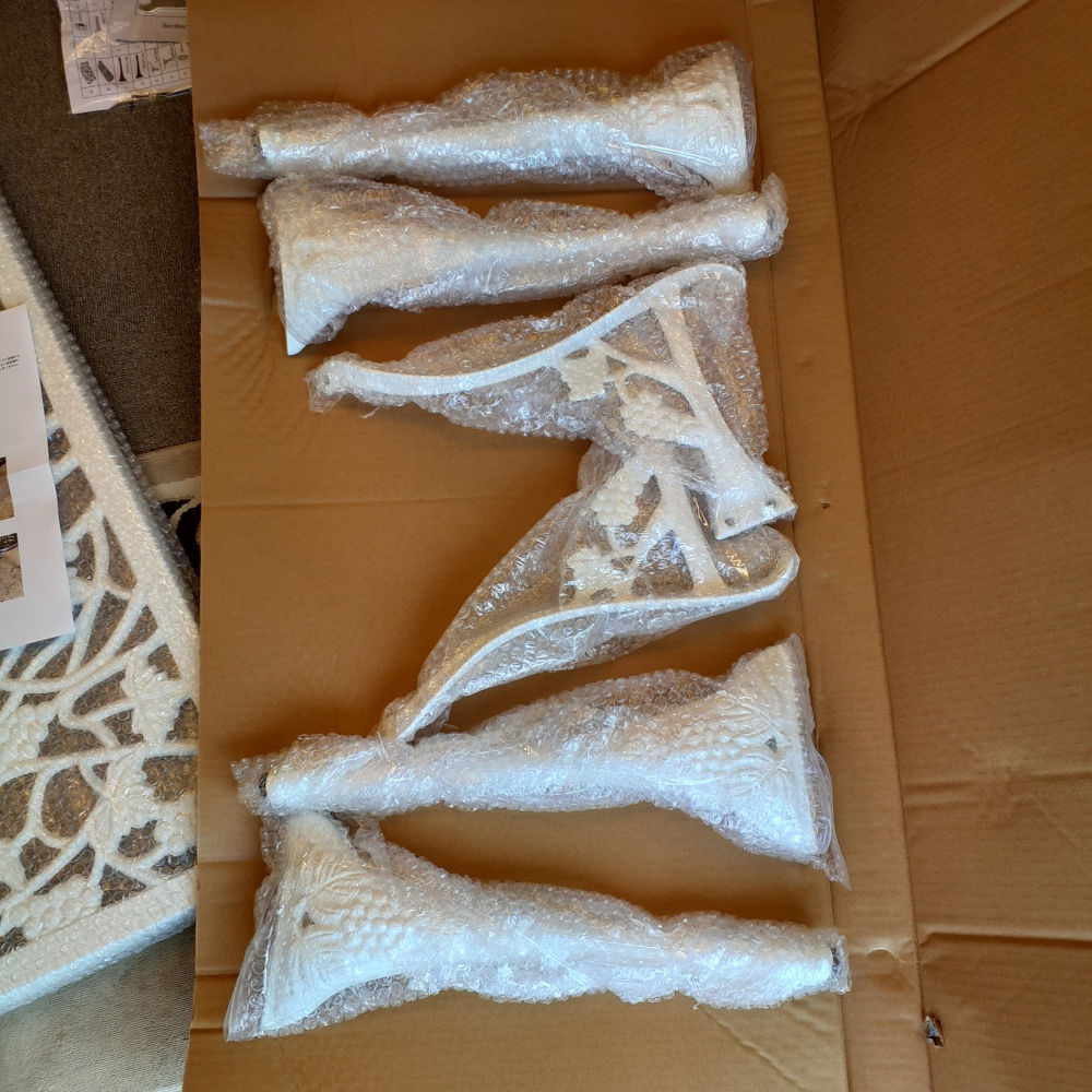 見た目が、重厚で可愛い高級感のあるレース模様の白いベンチです。