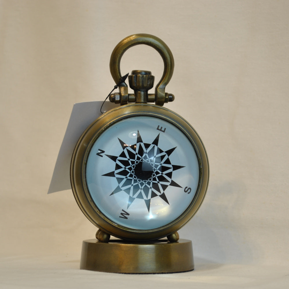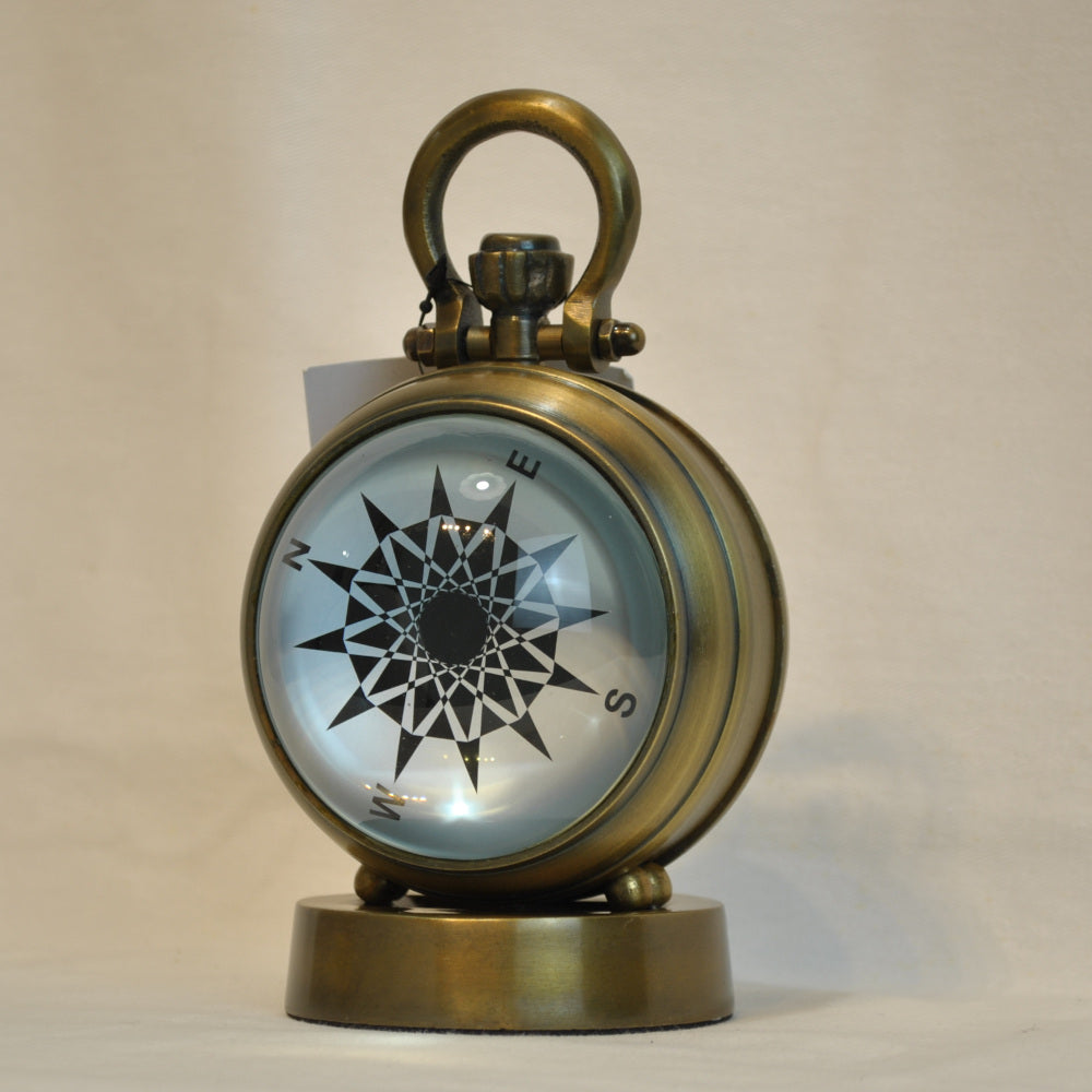 方位磁石がモチーフのアンティーク調の時計、落ち着いたブロンズ色に輝く球型のおしゃれなテーブルクロック(置時計)です。