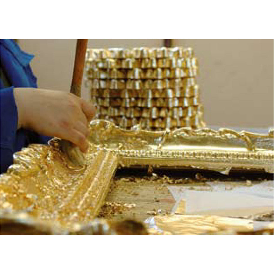 フレームには、金・銀の箔加工を施したゴージャスなものから彩色や彫刻を施したクラシカルなもの、スタイリッシュモダンテイストなものまで、様々なデザインがあります。全てイタリアの熟練した職人が一枚ずつ手作業で作り上げており、ミラーに施されている面取りは、陽の光を受けると眩しいクリスタルのような美しい輝きを放つのが特徴です。