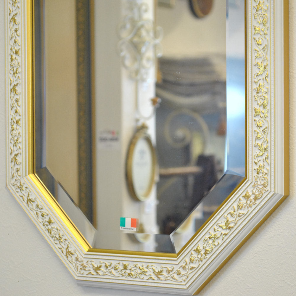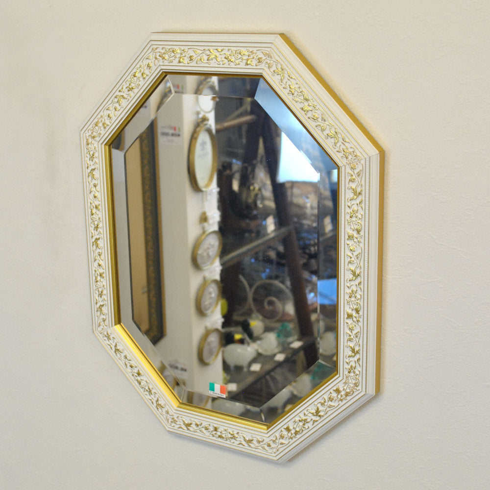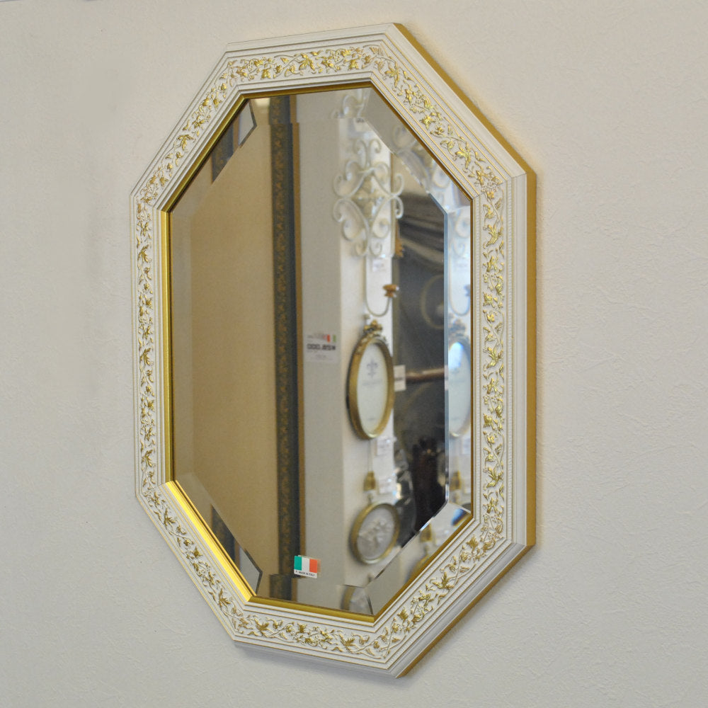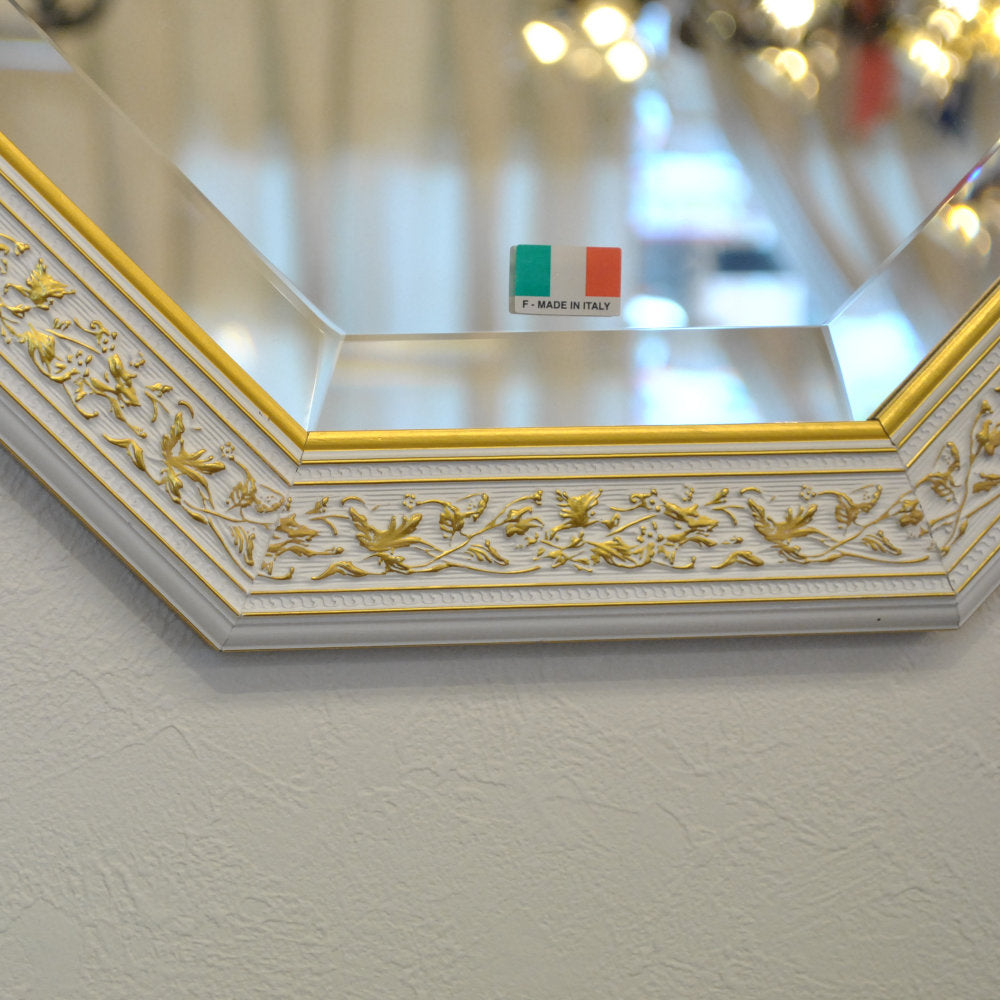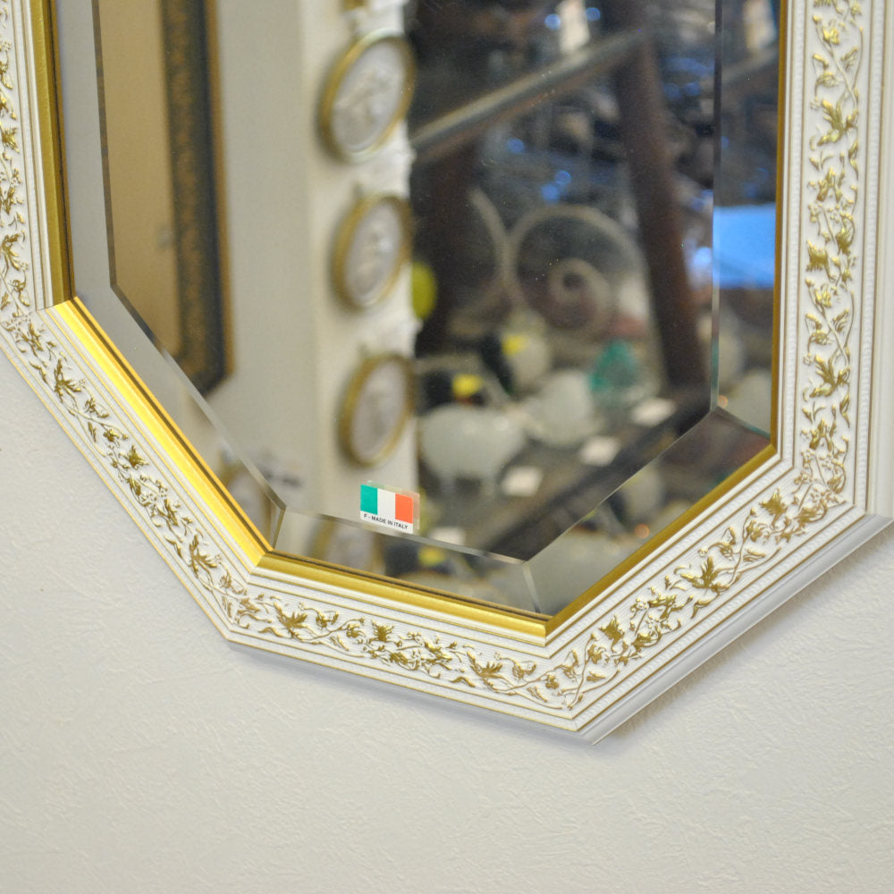 イタリアンホワイトの彩りがイタリアのクラシックらしい額縁老舗メーカーの人気定番の八角隅切り壁掛け鏡です。