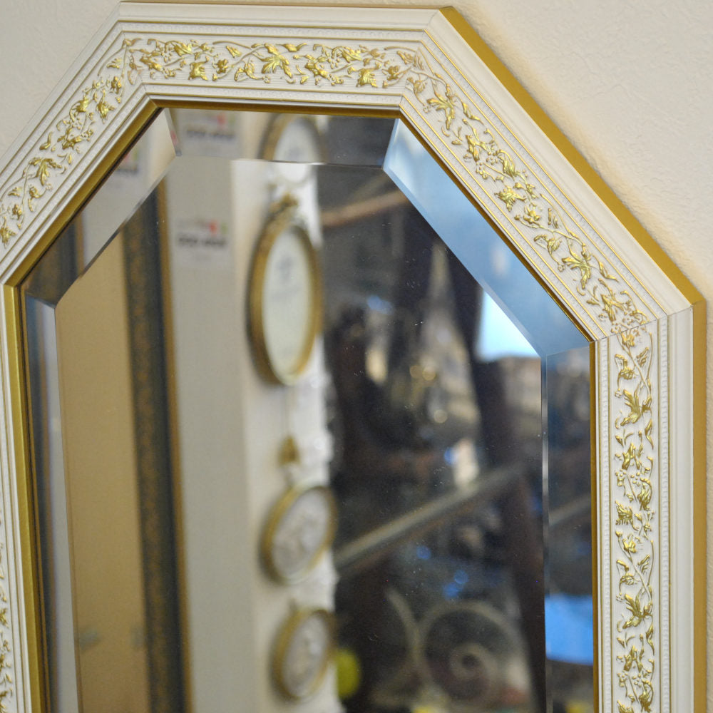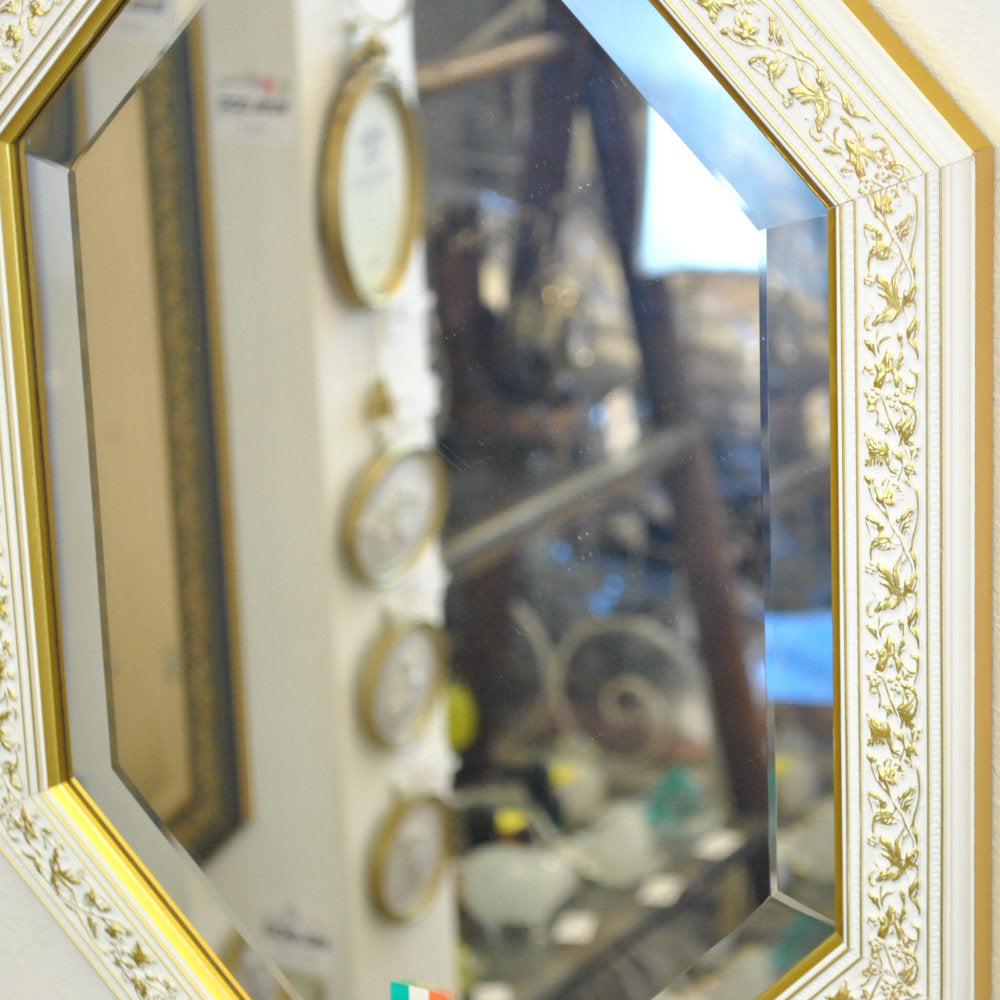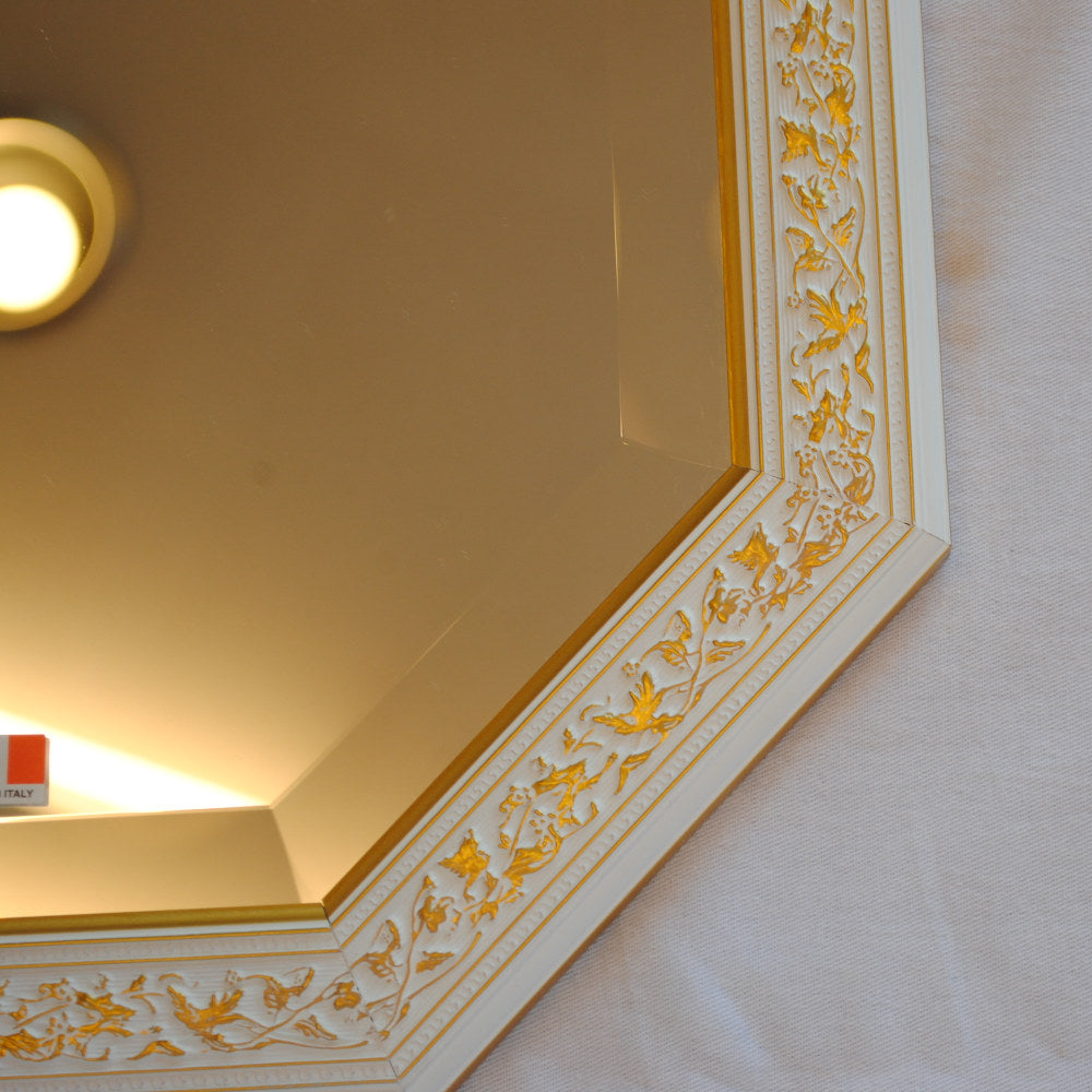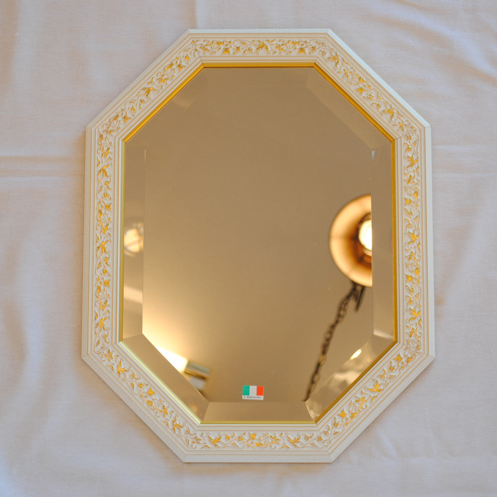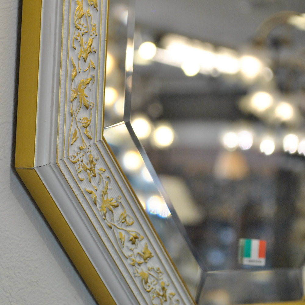 イタリアンホワイトの彩りがイタリアのクラシックらしい額縁老舗メーカーの人気定番の八角隅切り壁掛け鏡です。