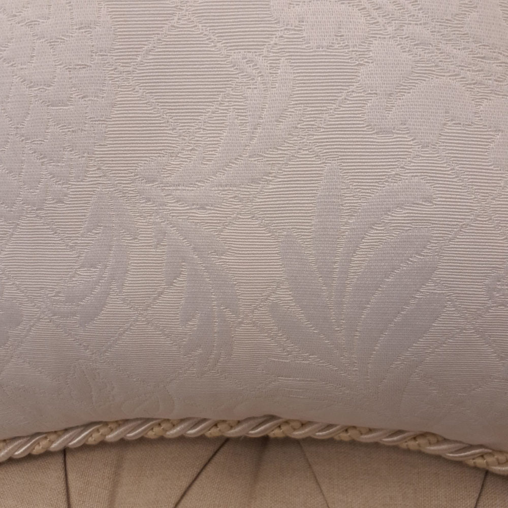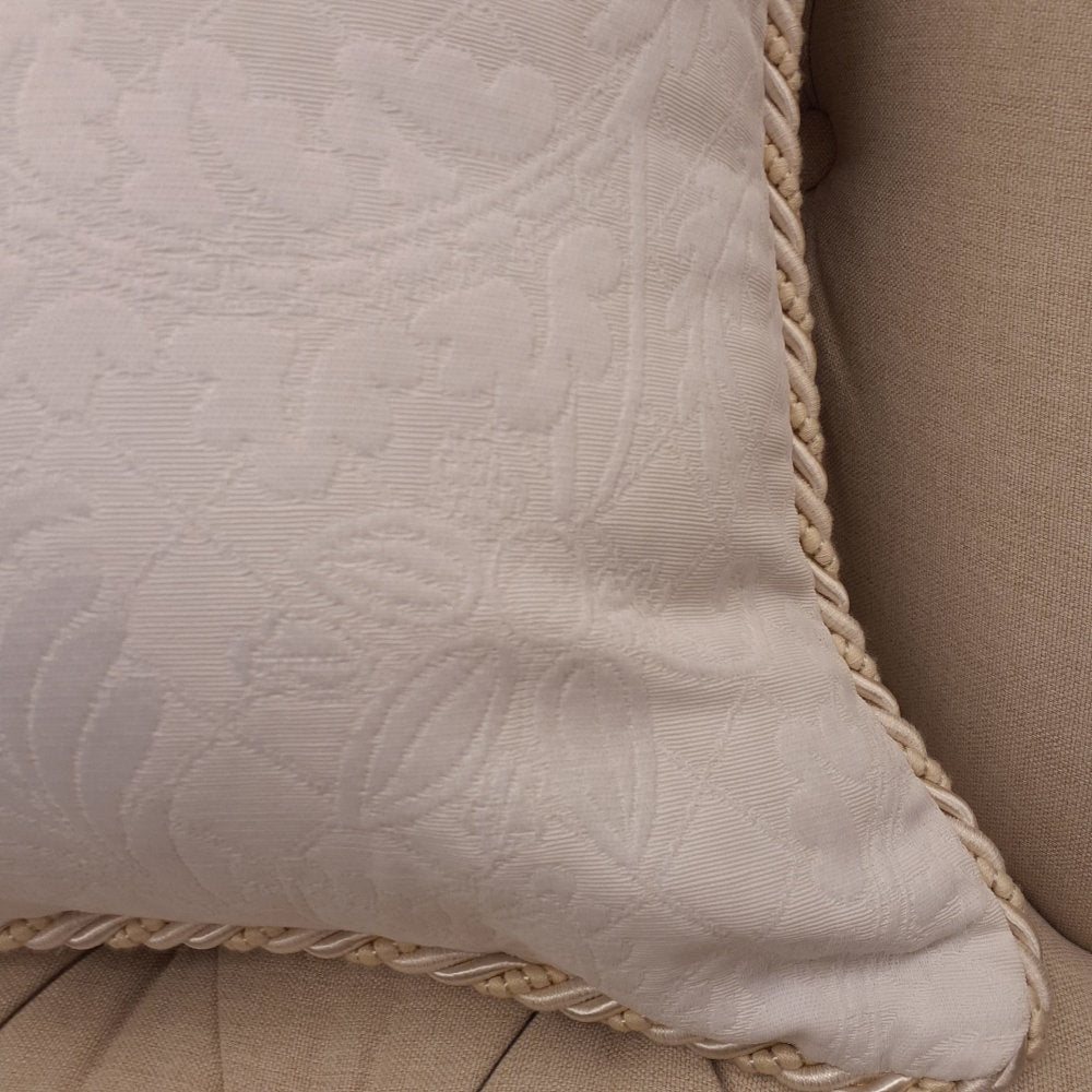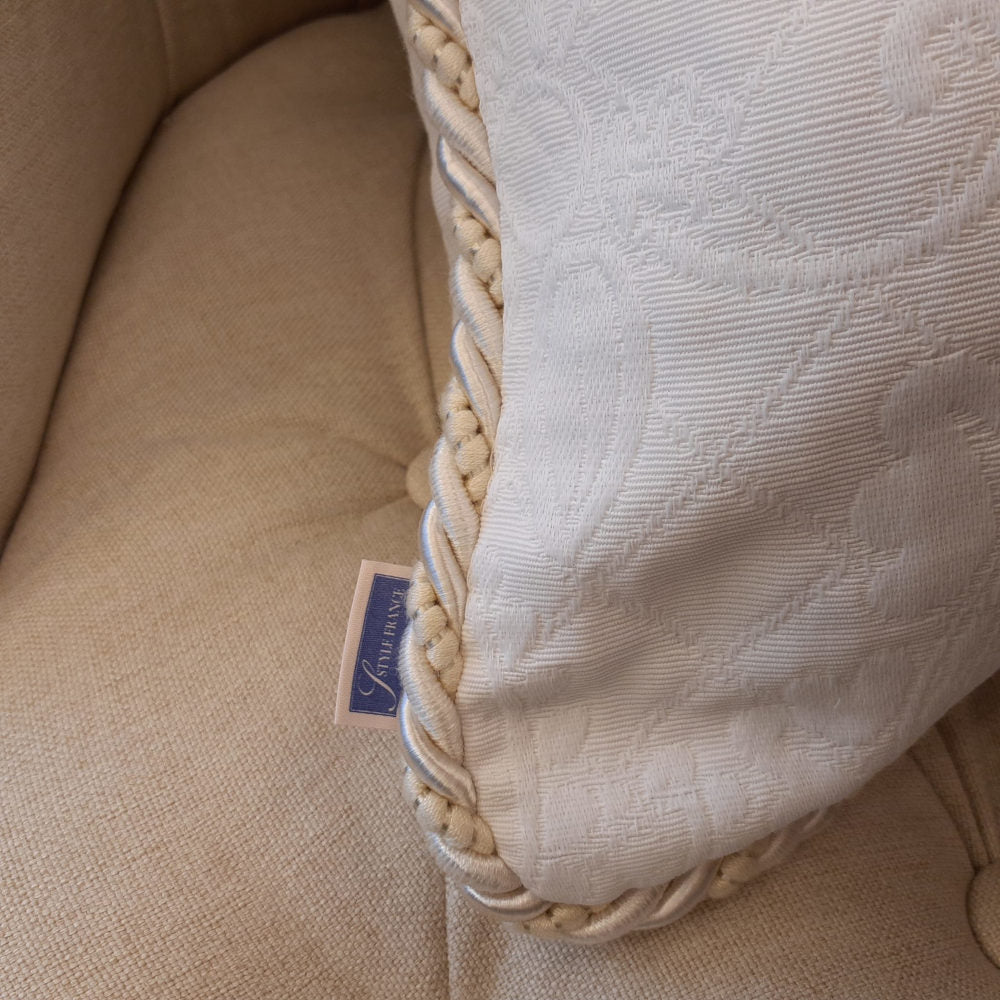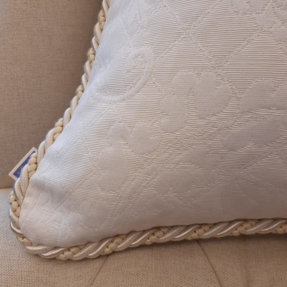 ホワイト系の糸で複雑な地紋柄を織り込んだフランス製生地にトリムが付いた高級クッションカバーです。