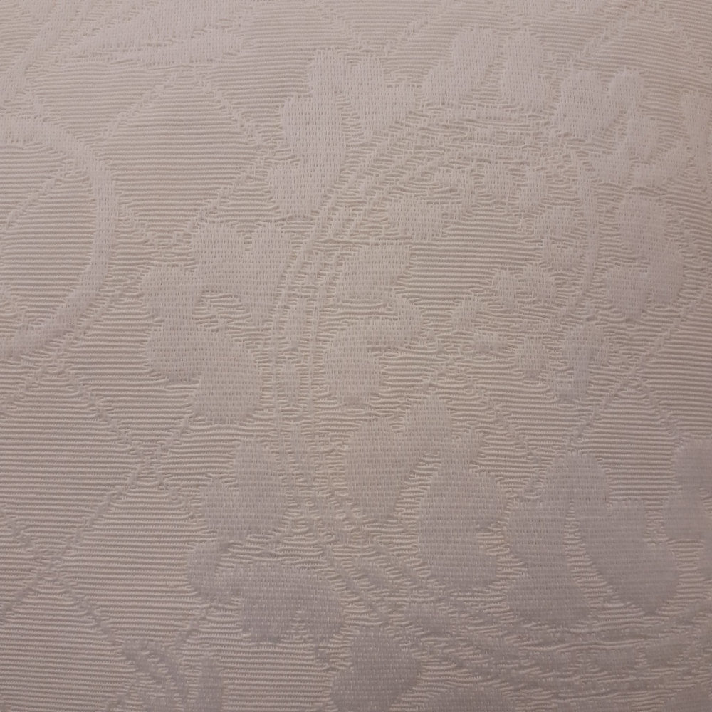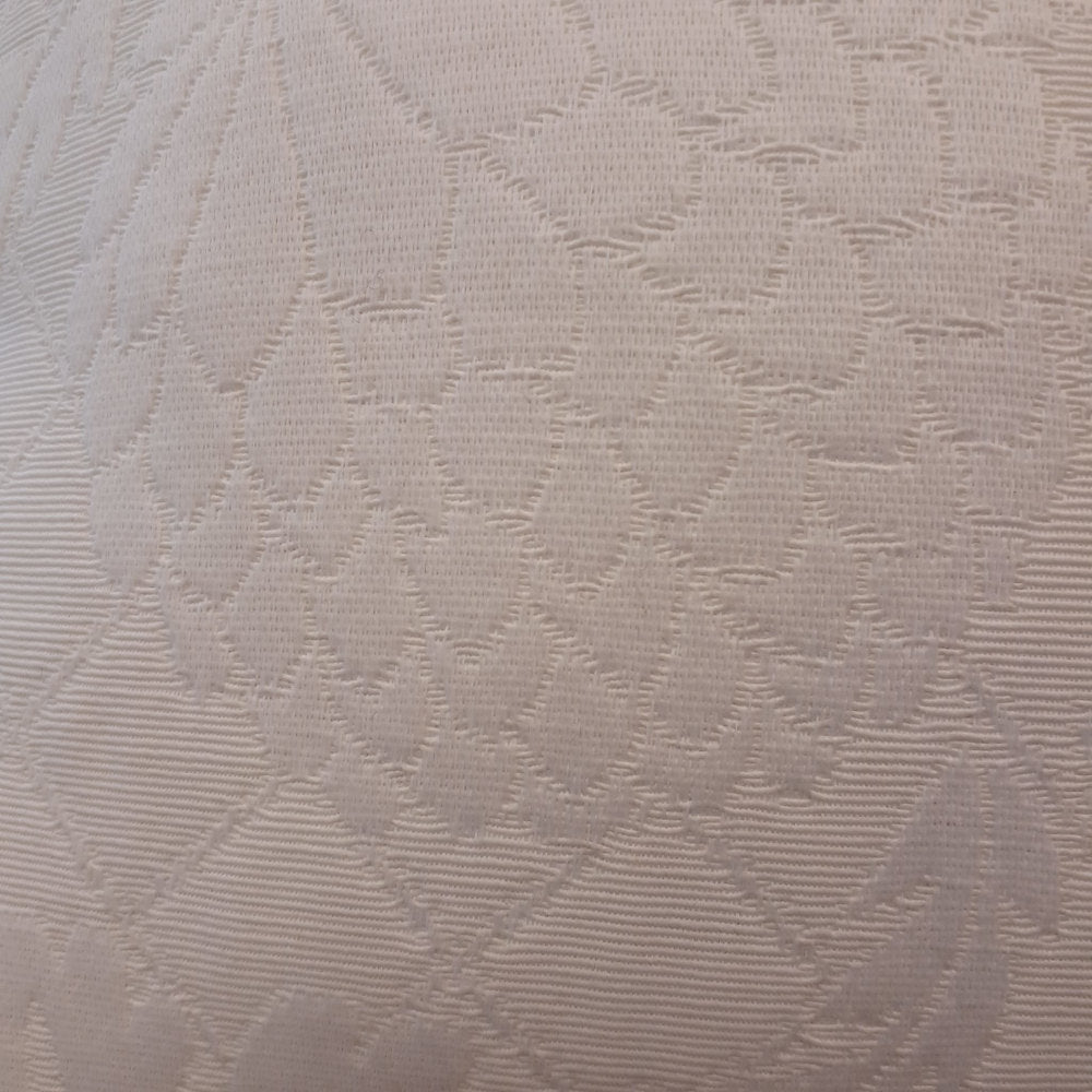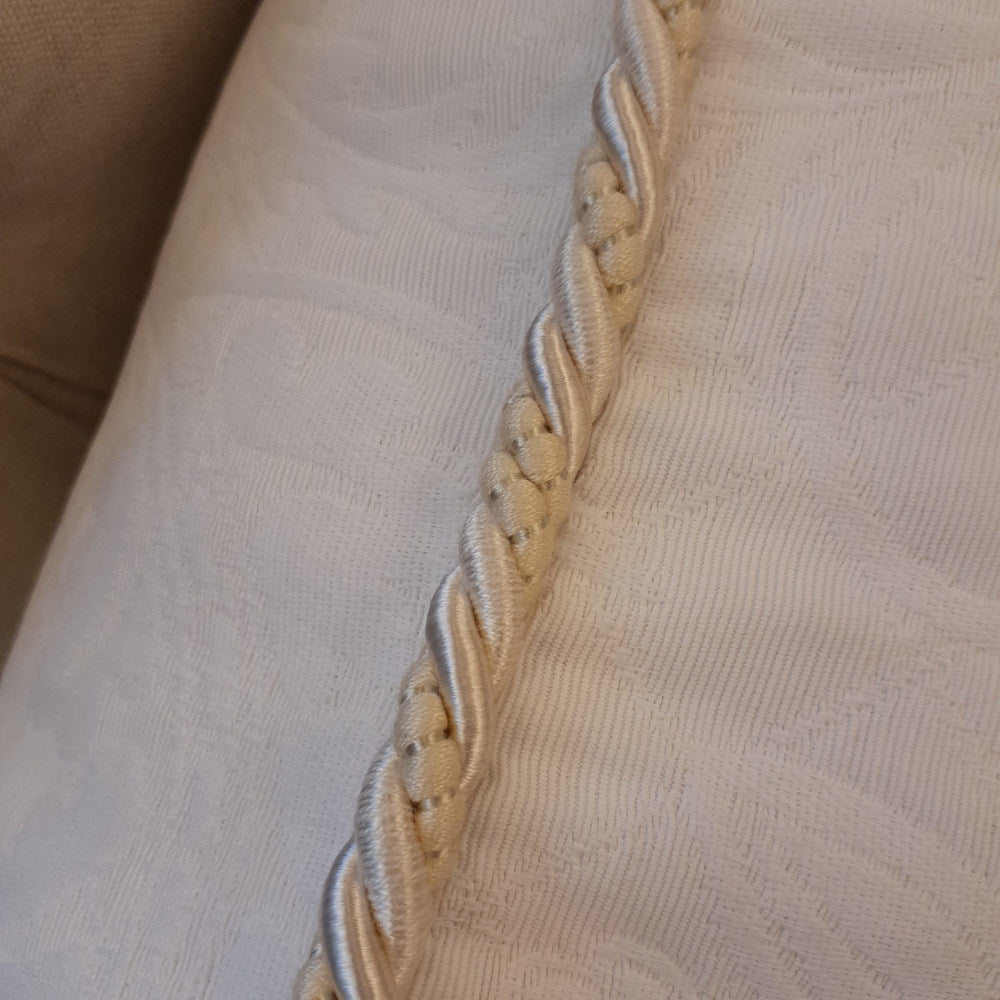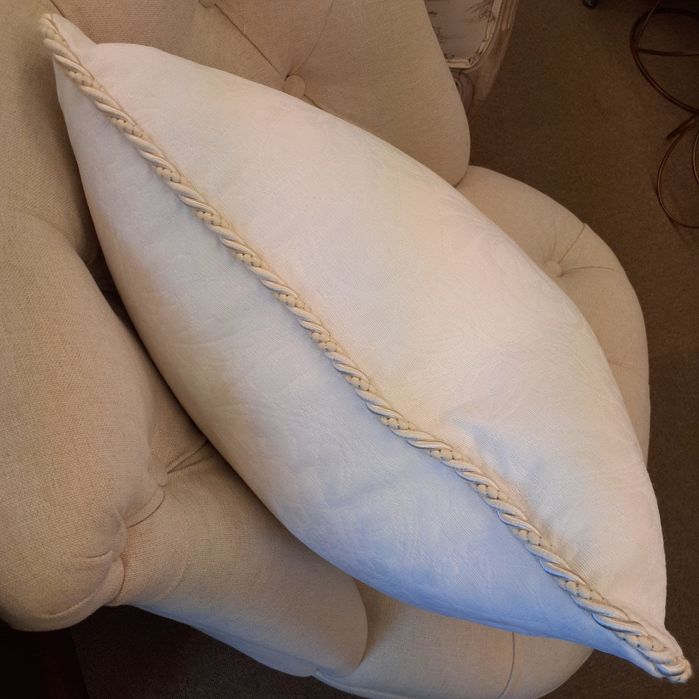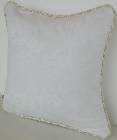 ホワイト系の糸で複雑な地紋柄を織り込んだフランス製生地にトリムが付いた高級クッションカバーです。