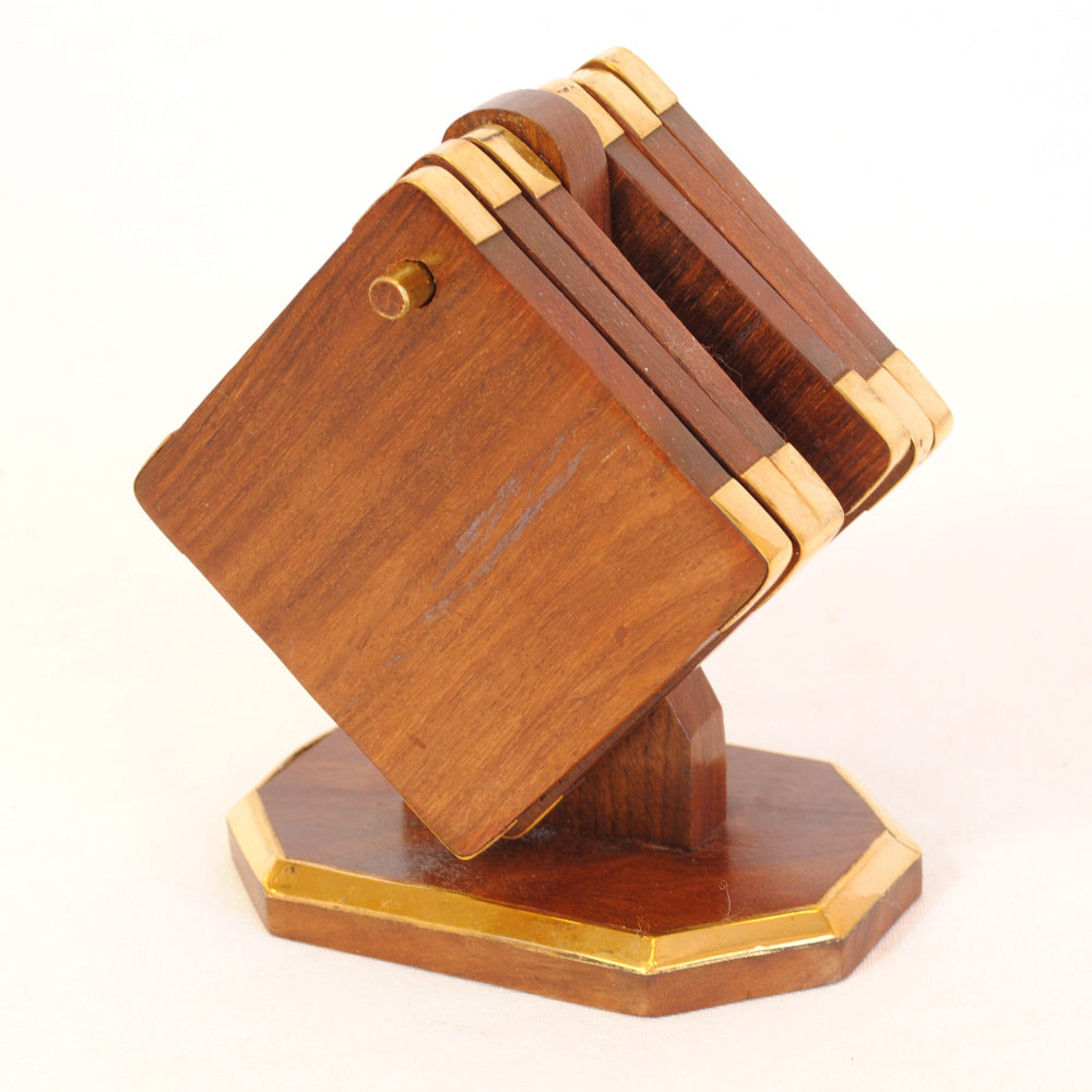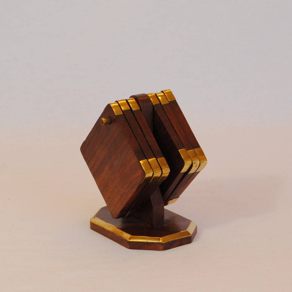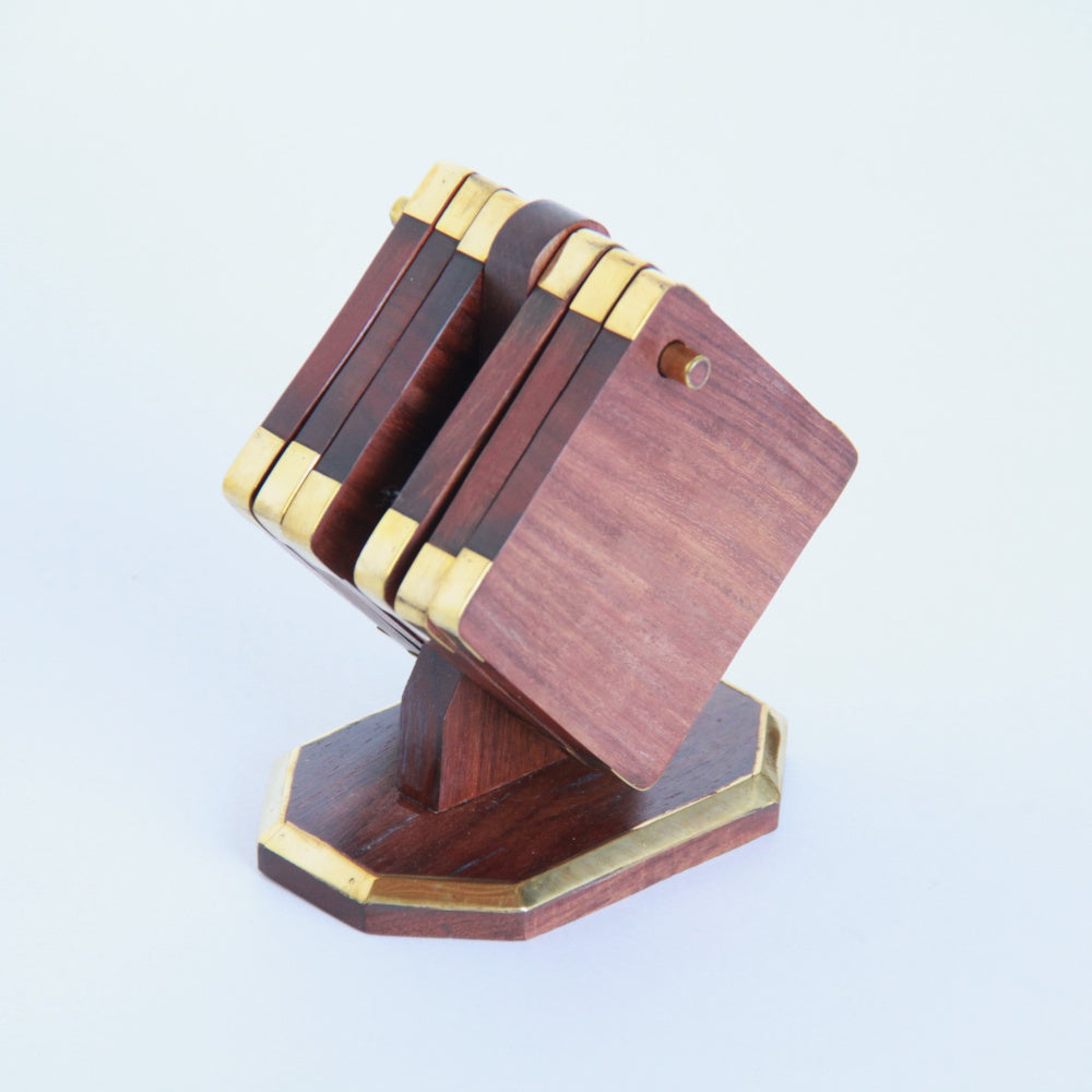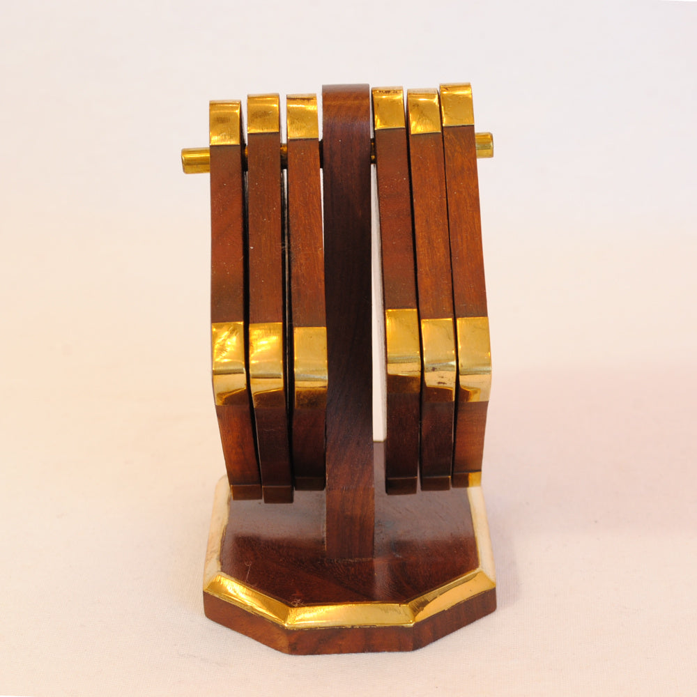 真鍮で縁取りした天然木フォルダー付きのコースター6枚セット。