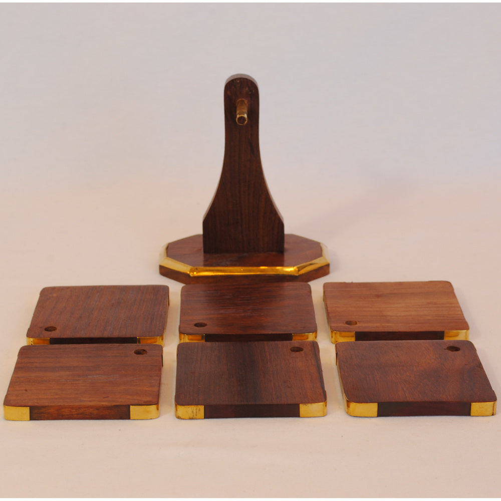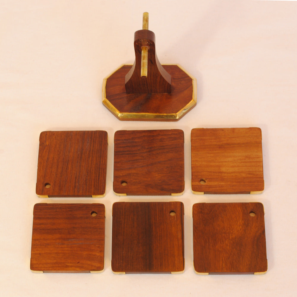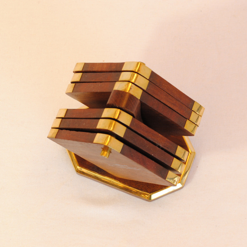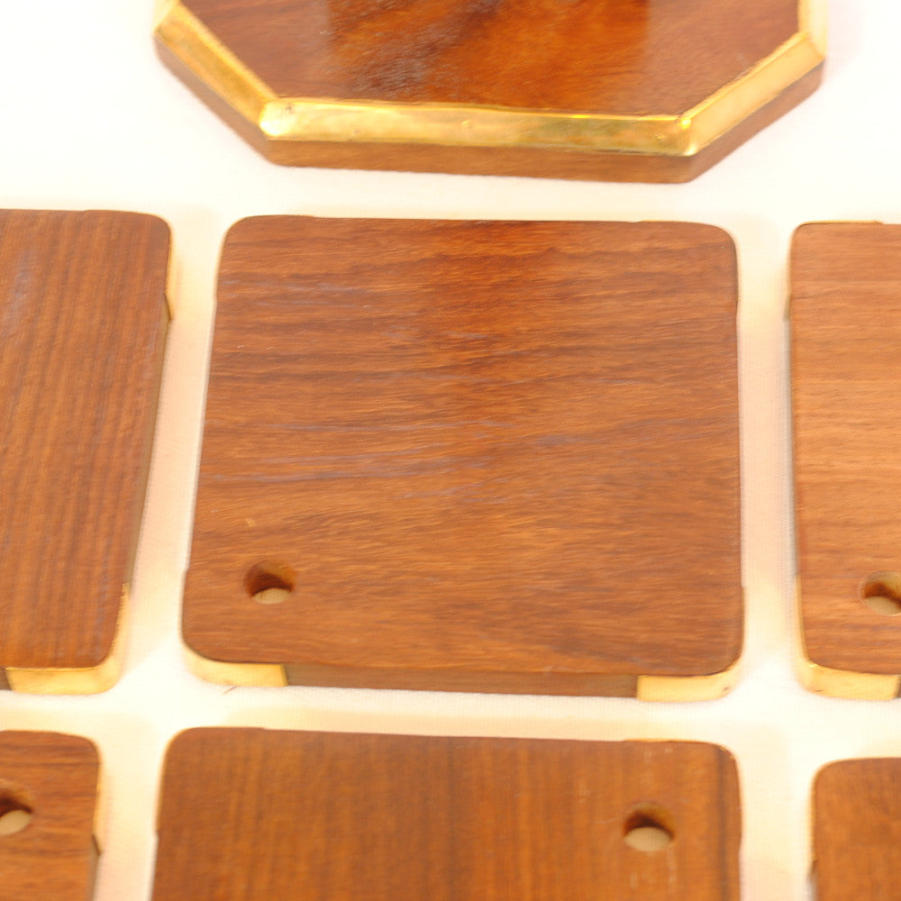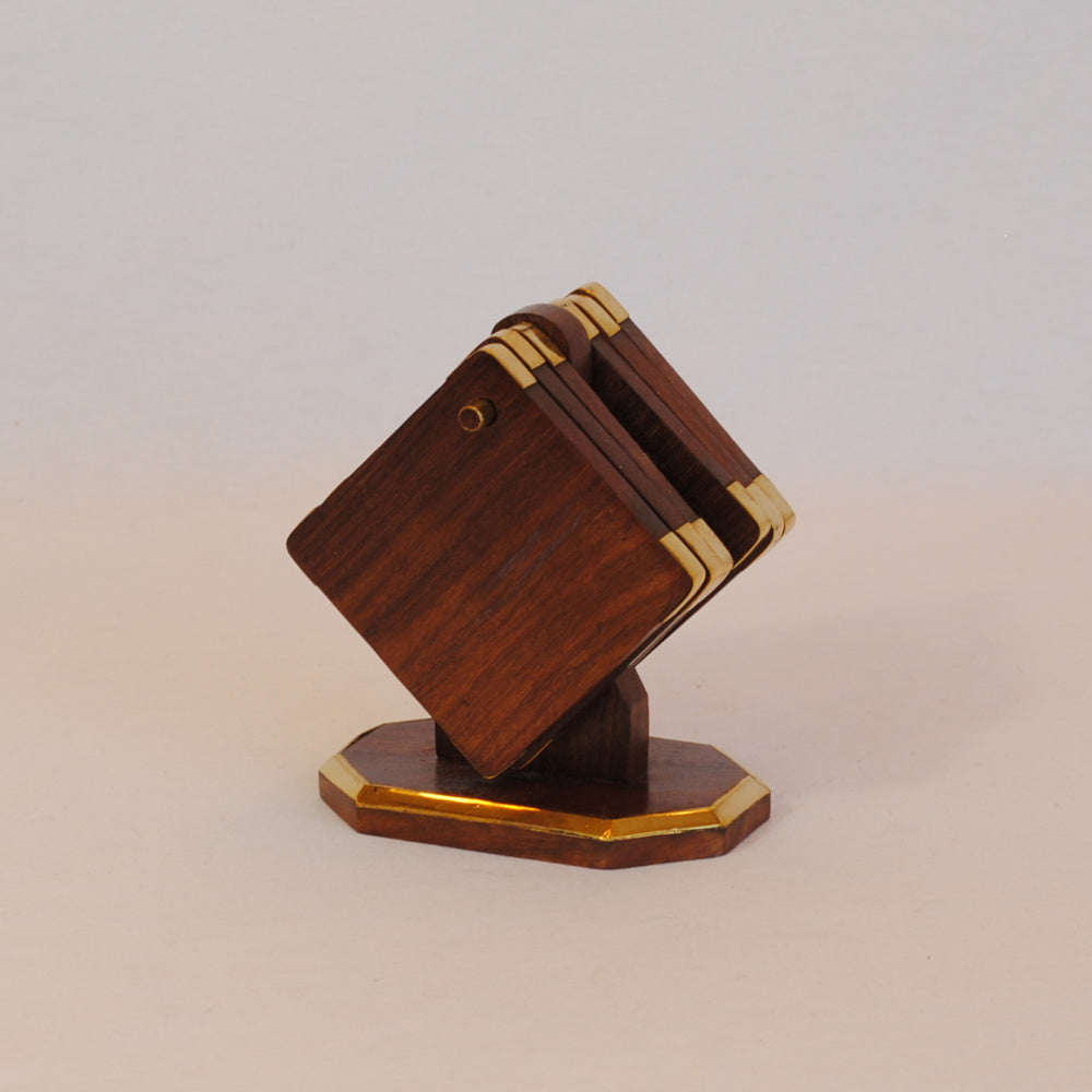 真鍮で縁取りした天然木フォルダー付きのコースター6枚セット。