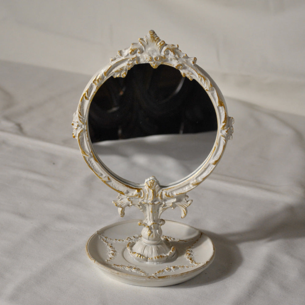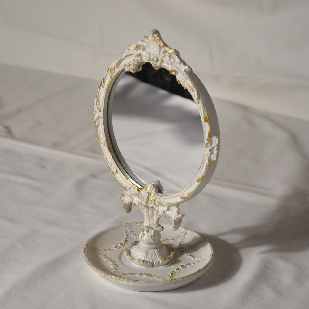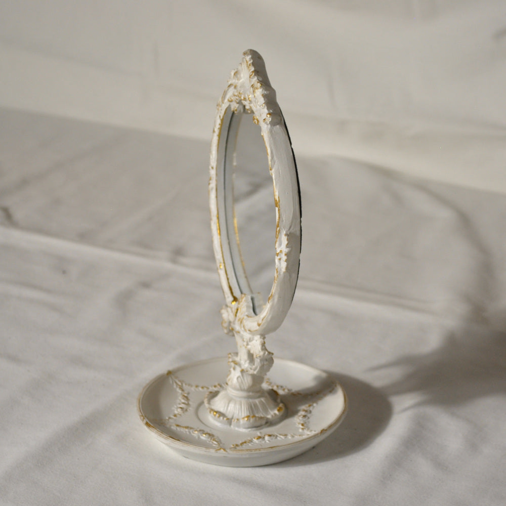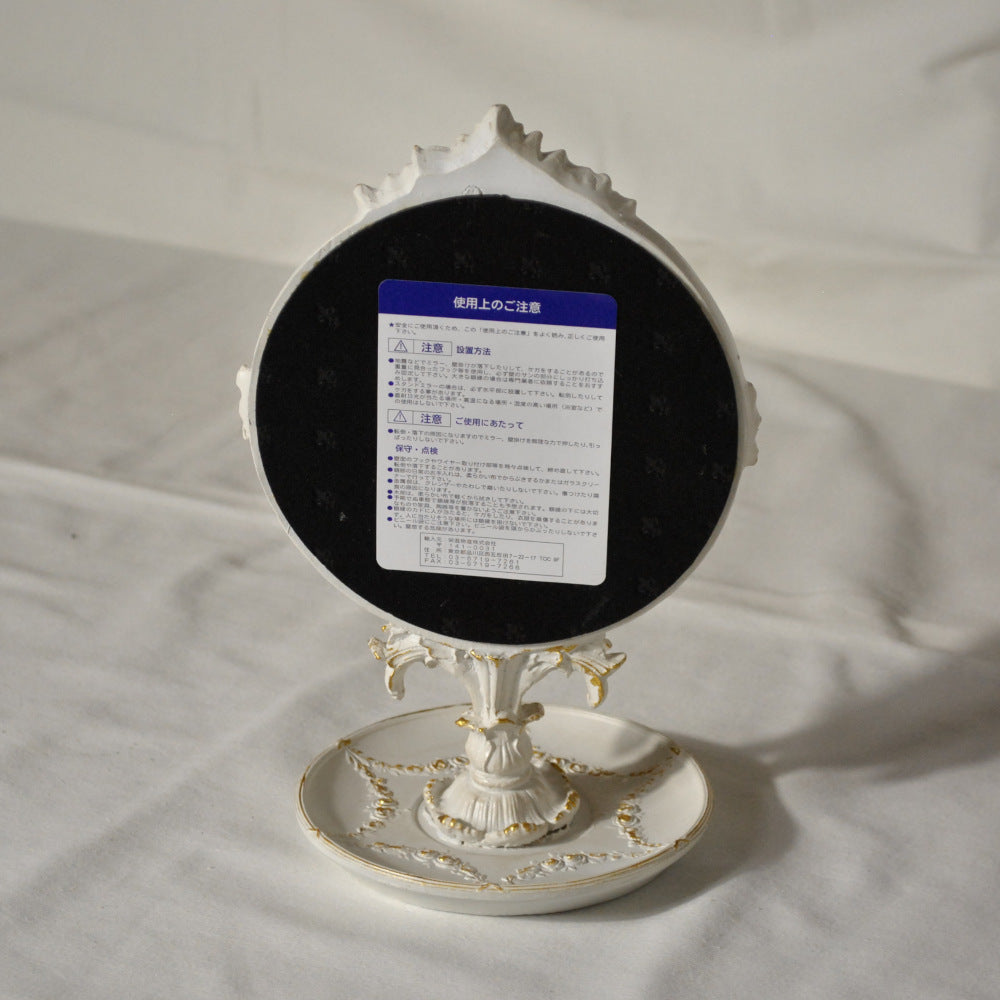 プレートに手鏡をスタンドアップした様なエレガントでアンティーク風なスタンドミラー(卓上鏡)です。
