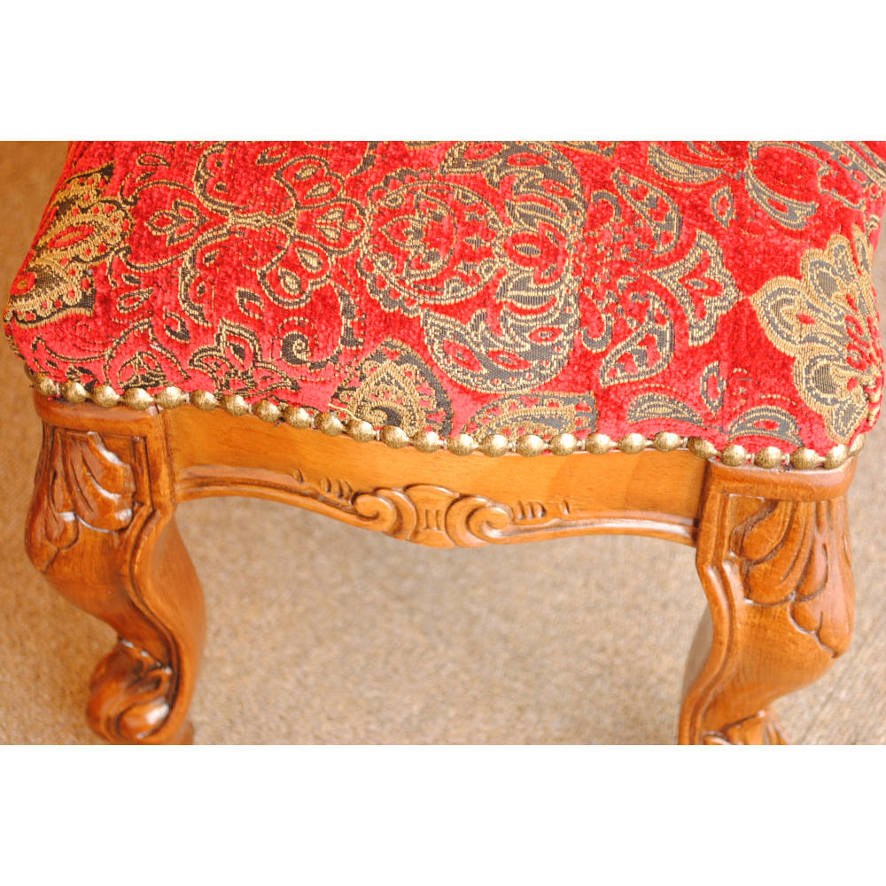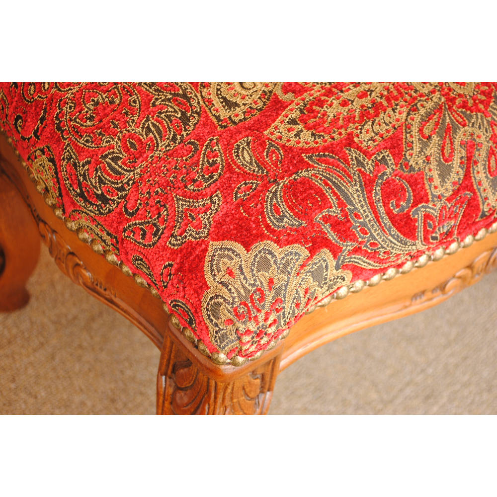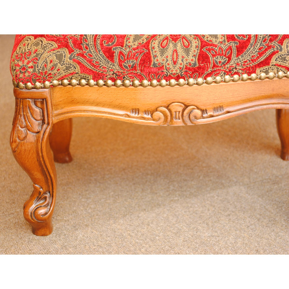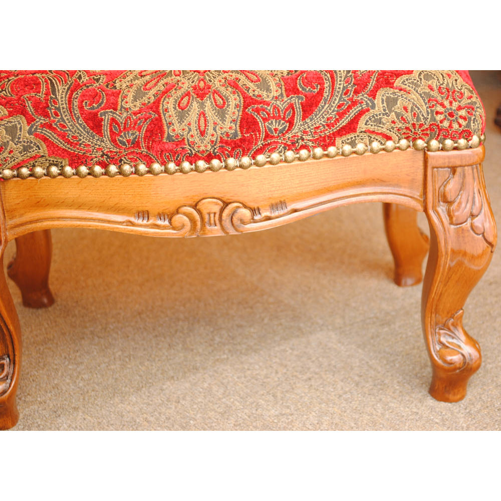 BR>クラシカルな彫りが施されたウォールナットの本体と脚部に座り心地も良い落ち着いた赤いベルベット生地が高級感を漂わせます。