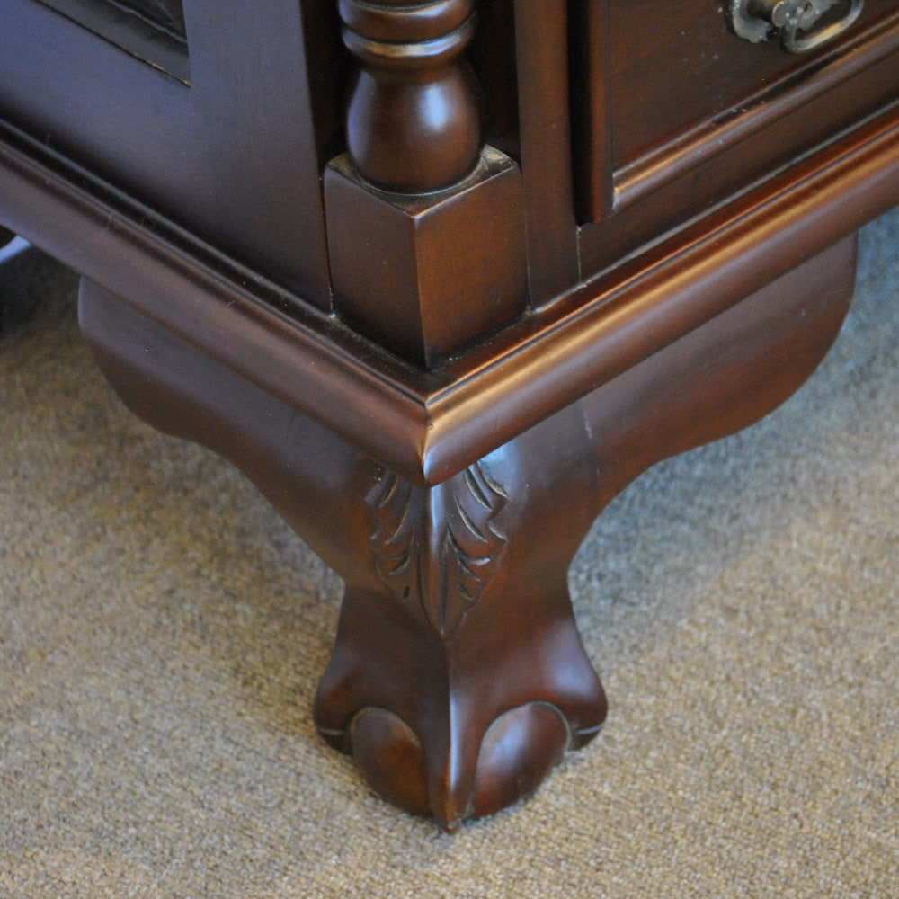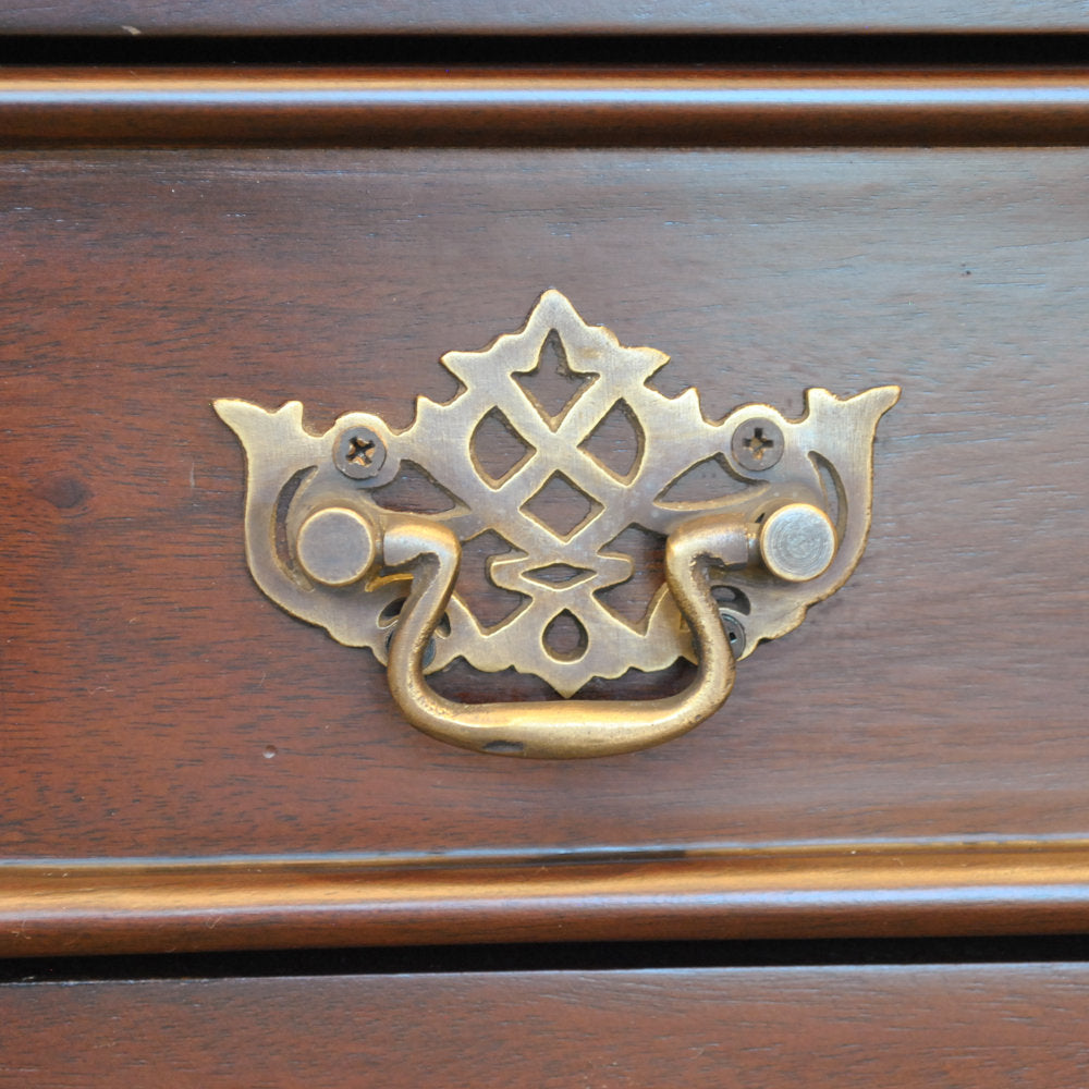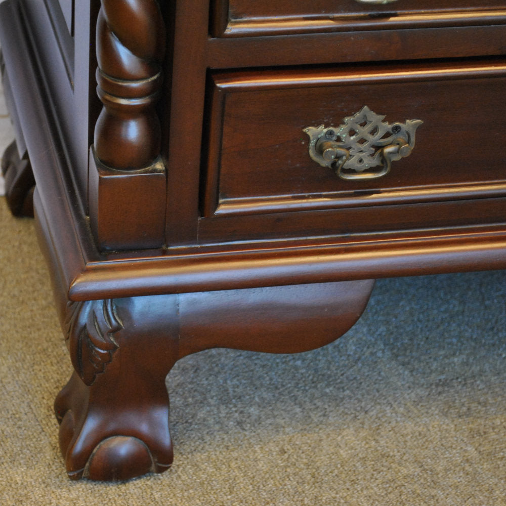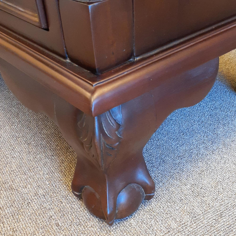 高級木材のマホガニー無垢材を使用し、蝙蝠(コウモリ)型の真鍮製の引き出し取っ手にボール&クロウ(玉と竜の爪)の足など、とても凝ったデザインに仕上げられています。