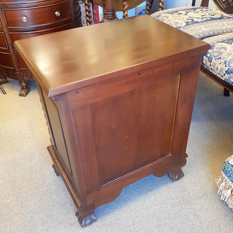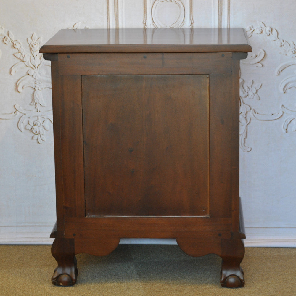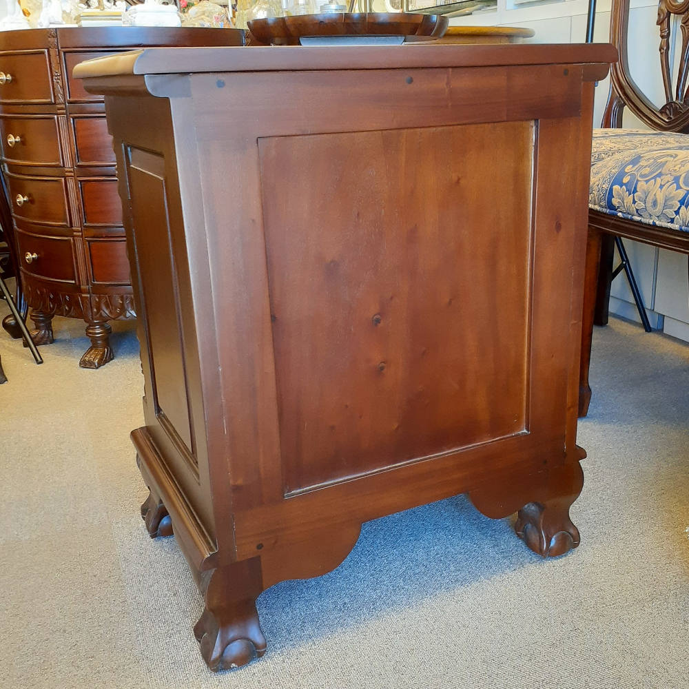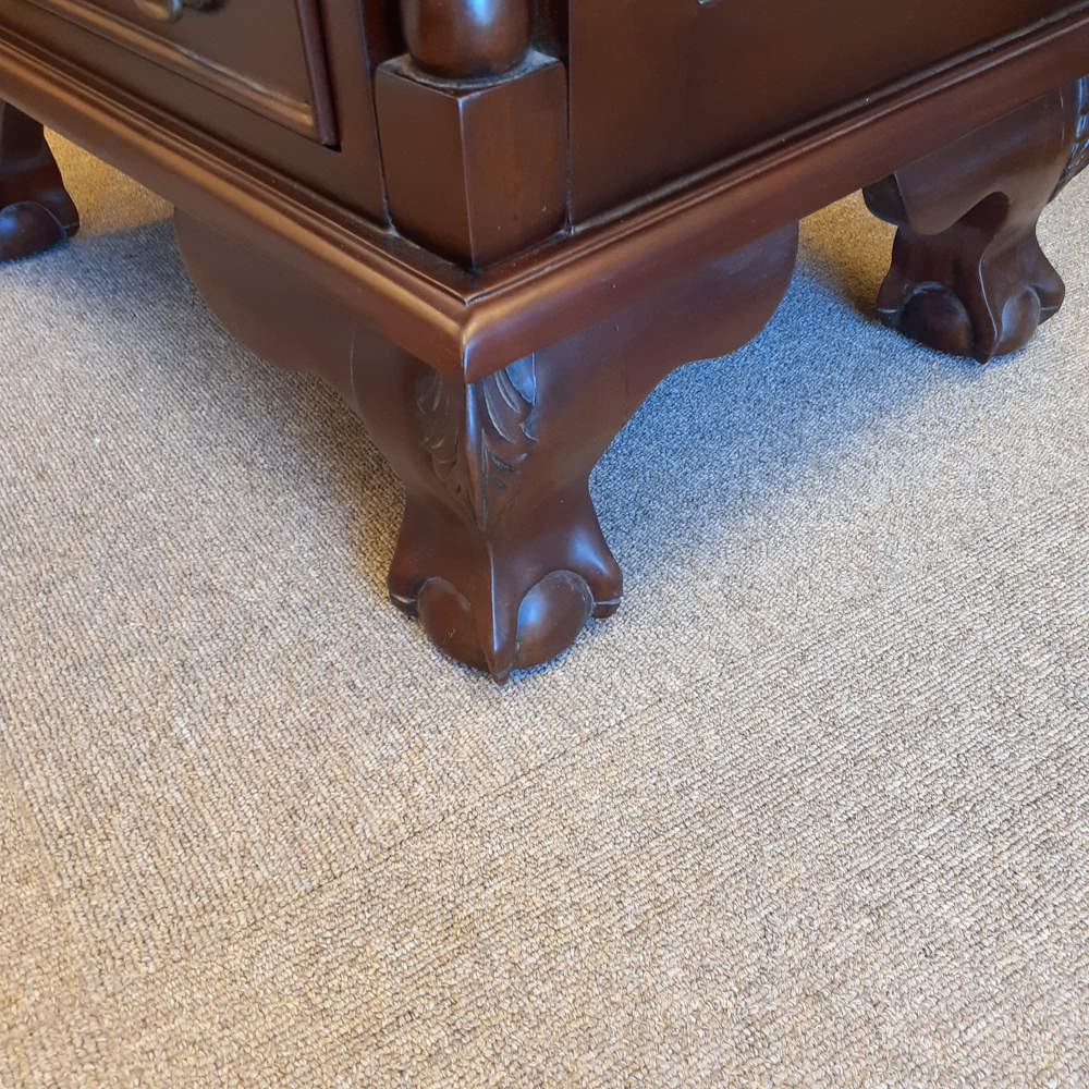 高級木材のマホガニー無垢材を使用し、蝙蝠(コウモリ)型の真鍮製の引き出し取っ手にボール&クロウ(玉と竜の爪)の足など、とても凝ったデザインに仕上げられています。