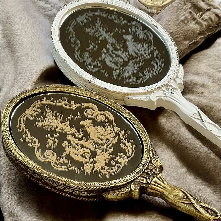 裏側鏡面には18世紀フランスの古典トワル・ド・ジュイ柄がエッティング風で描かれています。