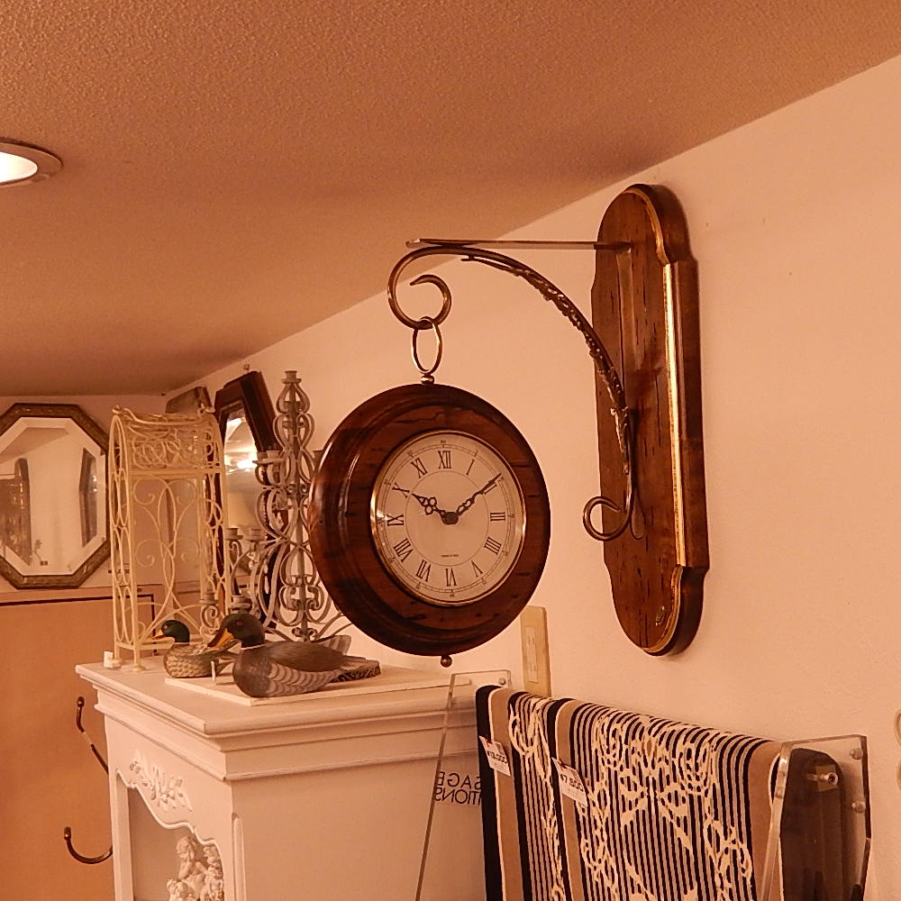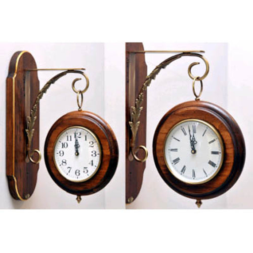 古木の台座を壁に固定して真鍮製取付ステーに吊り下げるタイプで駅構内ホームで上がり下がりの両側から時間が見え易い様に一台の裏表両面にアラビア文字とローマ数字大文字文字盤とそれぞれ違った二台の時計がはめ込んであります。
