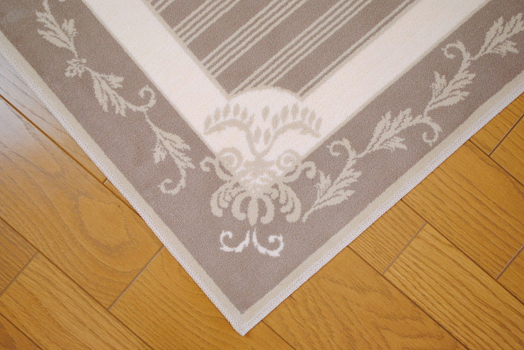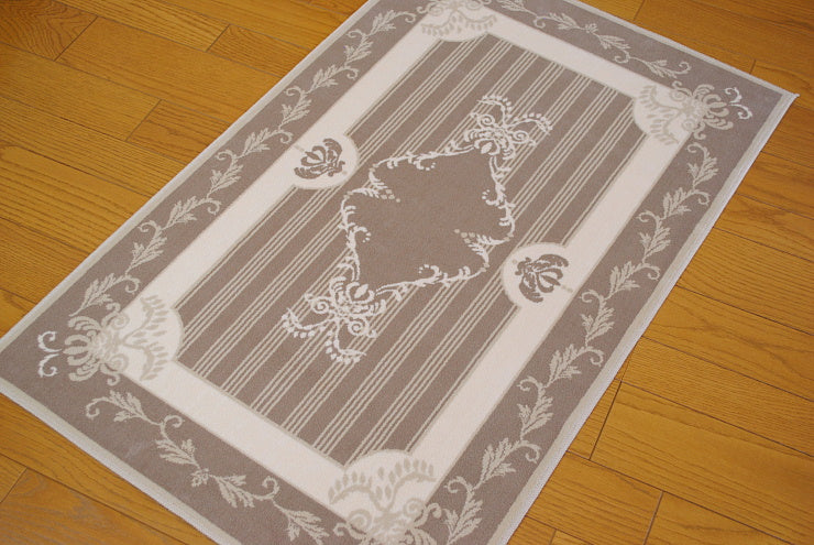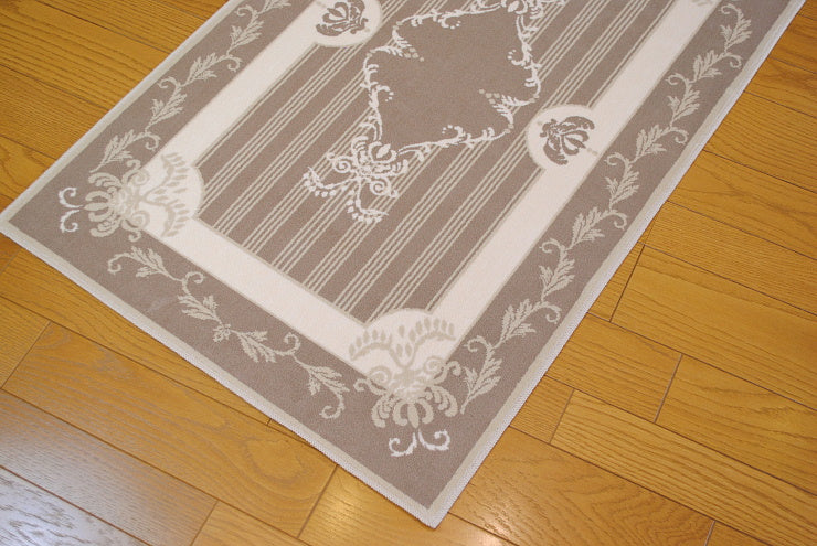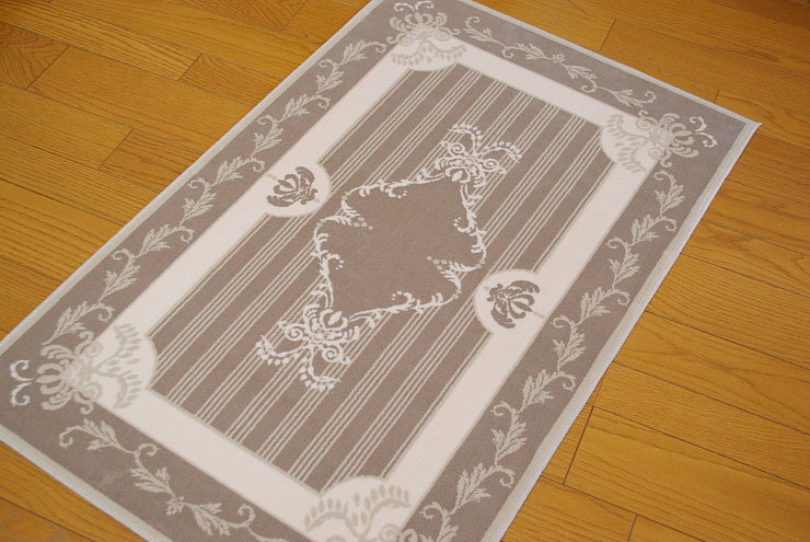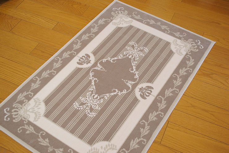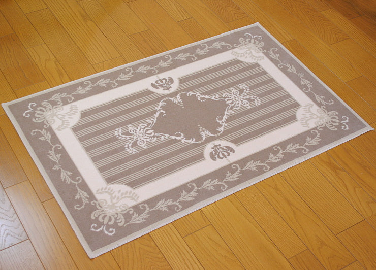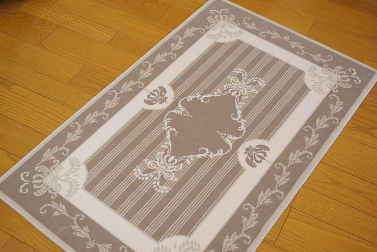 こちらのフランス製ラグは、シルクの様な優しい肌触りのオーガニックなコットン生地を使用していて暑い夏でも寒い冬でも一年中快適にお使い頂けます。また、丸洗い可能なウォッシャブル対応のため、一年中清潔に使え、お子様やペットがいるご家庭でも安心してお使いいただけます。厚み高5mmの高密度な段通織りなので、毛足が立ったままで汚れ難く毎日のお掃除も簡単です。玄関ホールやリビングルームにお洒落なフランスのデザインのインテリアアイテムとして人気のあるアイテムです。